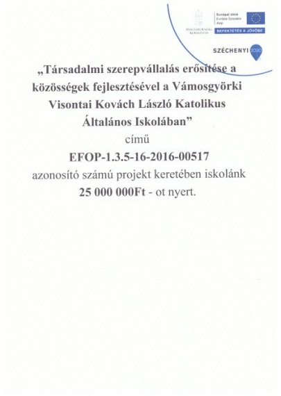 A pályázat neve: „Társadalmi szerepvállalás erősítése a közösségek fejlesztésével a Vámosgyörki Visontai Kovách László Katolikus Általános Iskolában”