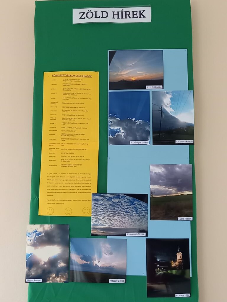 Márc.21-én, a Víz világnapján erről az alapvető és nélkülözhetetlen anyagról tudhattak meg többet a gyerekek. A szünetekben „vizes” játékokban mérhették össze ügyességüket, erejüket. Márc.22-én Mátraházán, a Naphimnusz Parkban jártak tanulóink. Márc.24-én Jakab Tibor természetfotós kiállításának megnyitóján vett részt az ötödik és hatodik osztály. Ezen a héten Gyümölcsoltó Boldogasszony napjáról tevékenyen, szemétgyűjtéssel emlékeztünk meg. A programok ápr. 7-től folytatódnak a fenntarthatósági témahéttel.